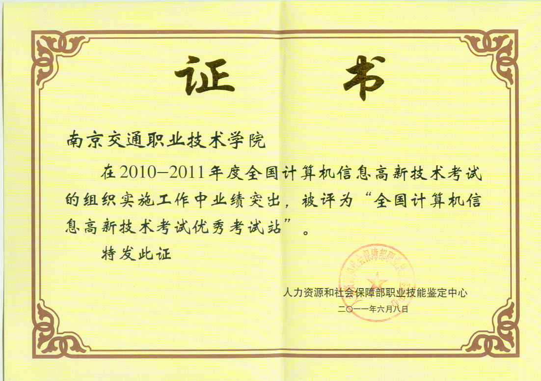 我系技能鉴定中心继连续三年被江苏省技能鉴定中心评为“计算机信息高新技术考试先进单位”,于今年6月又被人力资源和社会保障部职业技能鉴定中心评为2010-2011年度“全国计算机信息高新技术考试优秀考试站”。