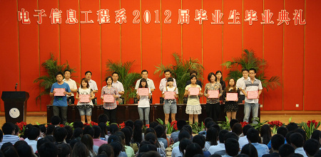 在学子们的热烈掌声中,张毅院长代表学院向学业有成,即将告别母校、踏上新的人生征途的2012届毕业生表示了最热烈的祝贺,并对全体毕业生提出四点希望:一是要仰望星空,坚定信念;二是要终身学习、不断进取;三是要宽容豁达、自强不息;四是要脚踏实地,勤奋敬业。