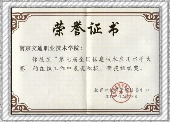 “中国航信杯”第七届全国信息技术应用水平大赛颁奖典礼与2012年12月18日在北京大学百周年纪念讲堂的顺利召开,原国家教育部副部长、中国高等教育学会会长周远清教授,教育部高等教育司副司长刘桔,教育部教育技术信息管理中心薛玉梅处长等参加了颁奖典礼。大赛由教育部教育管理信息中心主办,以提高信息素养、培养动手能力、提升就业技能为宗旨,是目前规模最大、影响力最广的实用型信息技术人才大赛。比赛形式分为个人赛和团体赛两种,考试科目涵盖了程序设计、软件应用、艺术设计、移动互联网、电子工程、CAD技术等专业领域。