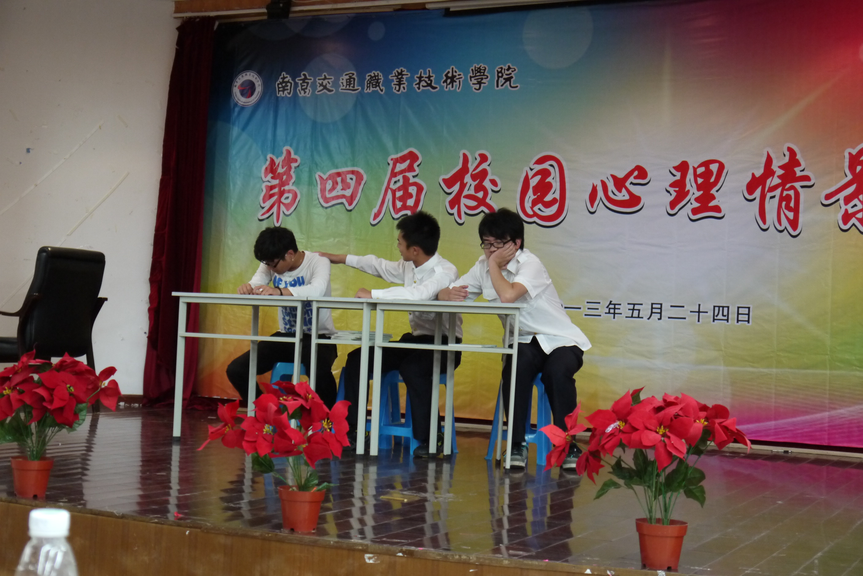 为增强大学生心理健康意识,南京交通职业技术学院第四届校园心理情景剧大赛于2013年5月24日在明德楼报告厅如期举行。活动中,我院选手124023班李炀、成勇男、杨书超、崔学玲、宋锦辉、许春明;124022班张涵、陈宗扬;124031班周钱多、陆艺超共十位同学出演了《蜕变》,节目精彩,内容感人肺腑,最终获得一等奖。
