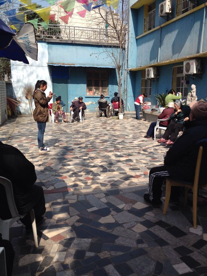 志愿者学生在为老人们讲说故事,为他们解闷