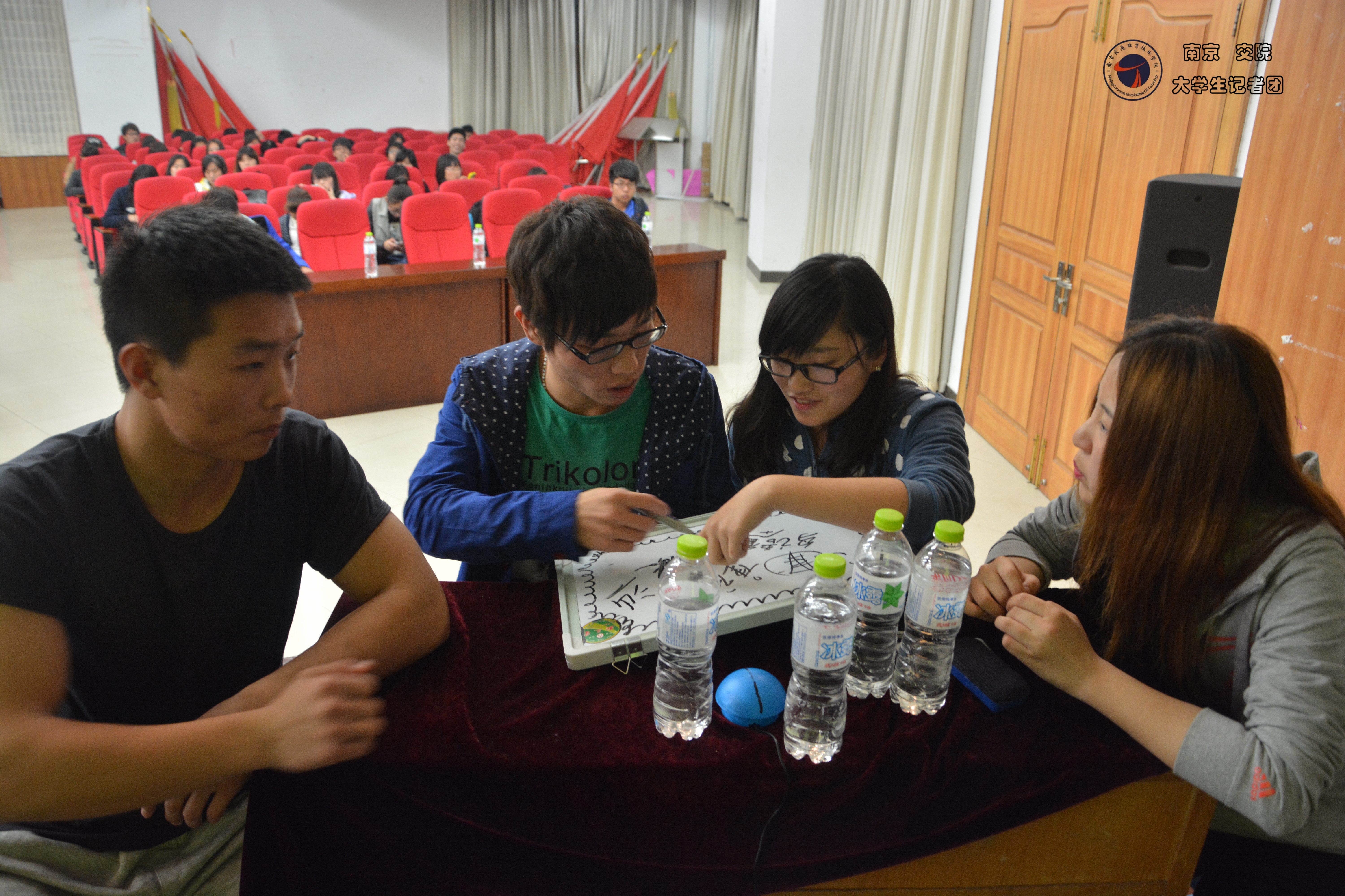 晚,我校“交院猜谜语大会”在明德楼报告厅举办。134022班杨若兮、陈舒雯,134082班刘滋岳、姜坤四名