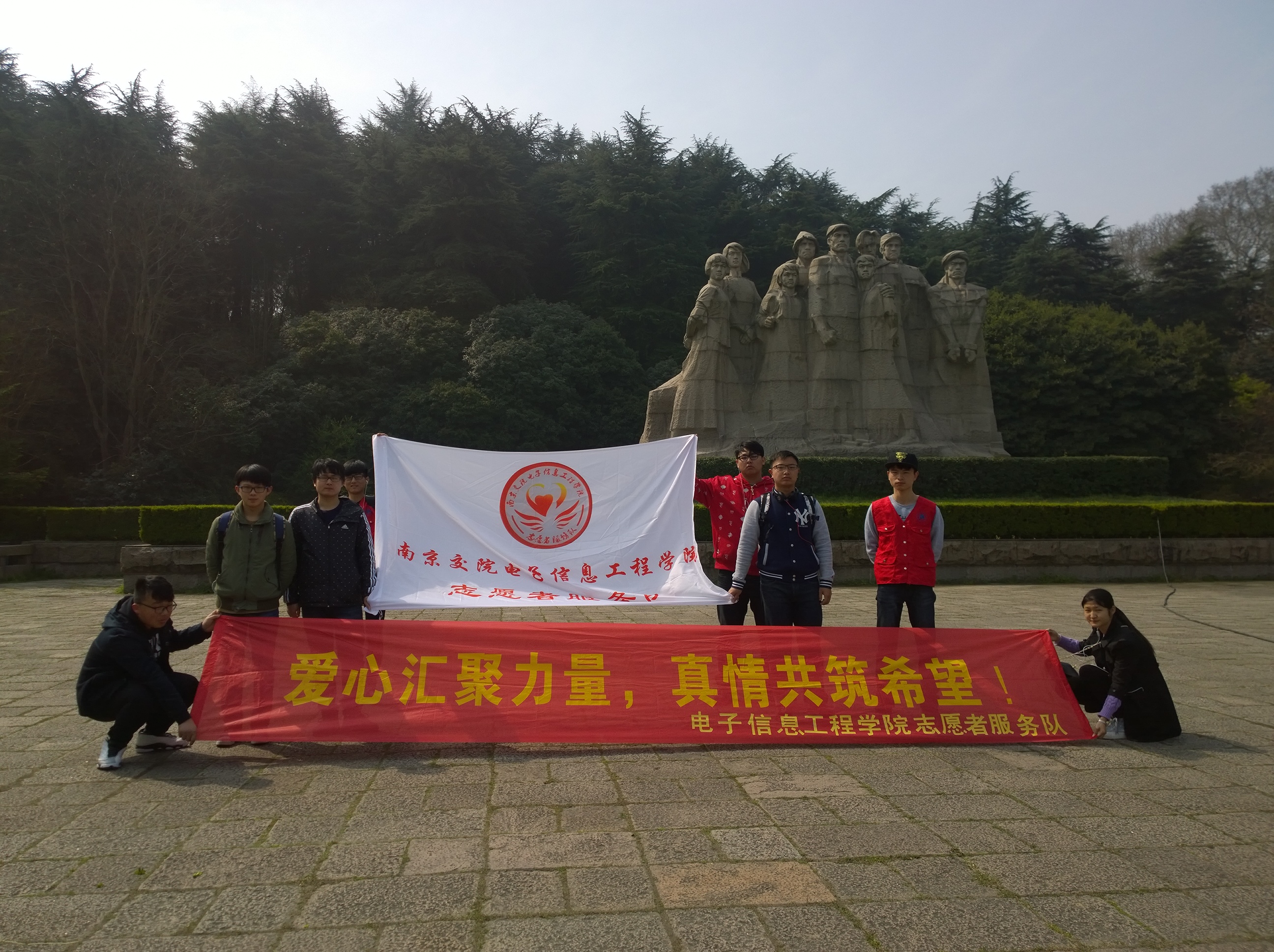 2015年3月28日上午九时,电子信息工程学院志愿者前往南京雨花台烈士陵园进行了为期一天的志愿服务。 志愿者们首先参观了纪念碑廊、烈士就义群雕、烈士纪念馆等众多红色景点,接着志愿者分为四组,围绕南京雨花台烈士陵园周边进行义务清洁和维持秩序等义务服务。下午五时,志愿者们启程返回学校,返回途中他们纷纷表示,此次活动对自己有着极大意义,希望此类活动能一直开展。