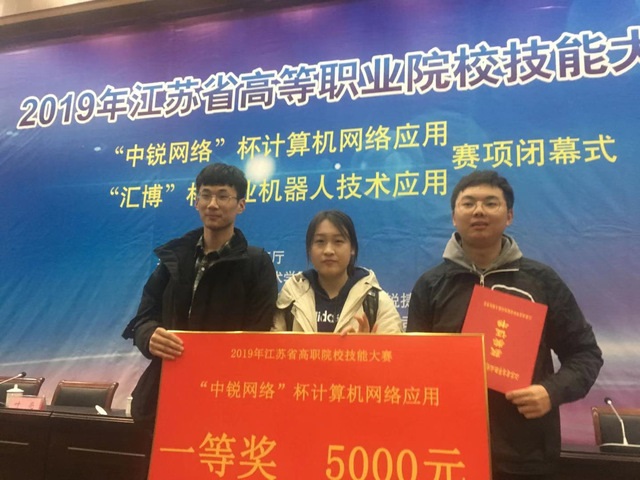 3月8日至10日,2019年江苏省高等职业院校技能大赛“中锐网络”杯计算机网络应用赛项在无锡职业技术学院举办。由我院2017级“计算机网络技术”专业陈园月、袁富山、戴永康三名同学组成的代表队在孙丹东、高水娟两位指导教师的带领下,与来自全省38所高职院校的参赛选手同台竞技,经过激烈角逐,最终获得团体一等奖的好成绩。