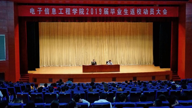 为进一步做好2019届毕业生返校工作, 5月6日上午,电子信息工程学院在图书馆报告厅召开2019届毕业生返校动员大会,电子信息工程学院党总支副书记张守磊、副院长高水娟、副书记张丽君、学工办主任徐敏、辅导员老师及全体返校毕业生参加,会议由党总支副书记张丽君主持。