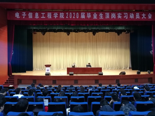 为进一步加强顶岗实习期间的教学和学生管理工作,11月21日上午,电子信息工程学院在图书馆报告厅召开了2020届毕业生顶岗实习动员大会。校保卫处副处长周家明、电子信息工程学院相关老师、2017级全体学生参加了大会。会议由学院党总支副书记张丽君主持。