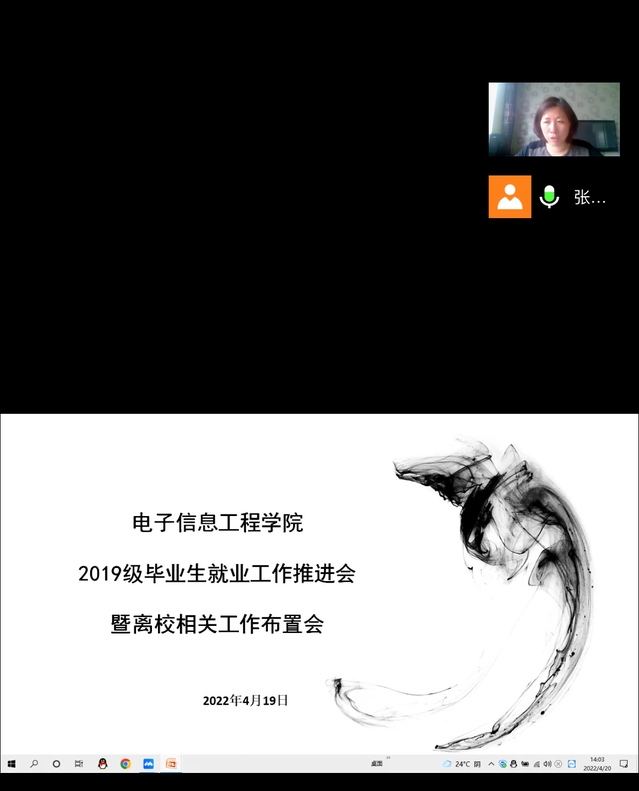 4月20日下午,电子信息工程学院2019级毕业生就业工作推进会暨离校相关工作布置会通过腾讯会议召开。学院党总支副书记张丽君、2019级全体班主任以及学院就业联系人参加会议,会议由张丽君副书记主持。
