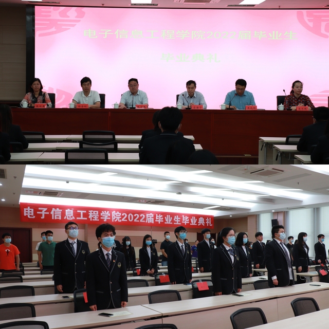 5月24日下午15点,电子信息工程学院2022届毕业生毕业典礼在图书馆B203举行,按照疫情防控要求,毕业典礼采用线上线下结合的方式进行。学校应海宁副校长,学生工作处张守磊处长、电子信息工程学院全体院领导、辅导员、班主任、教师代表及2022届30余名毕业生代表参加了线下毕业典礼,其余毕业生均通过腾讯课堂直播观看。毕业典礼由电子信息工程学院吴兆明院长主持。