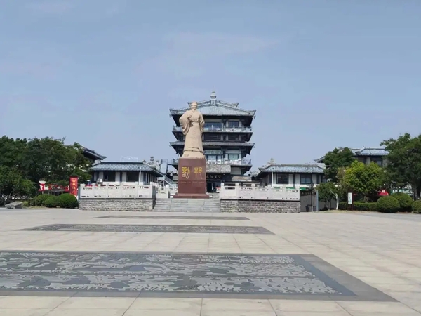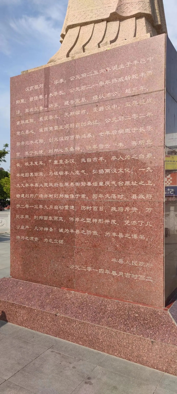 在组长的带领下,我们来到刘邦广场。在广场的正中央,有一座高约10米的的刘邦像,在刘邦的像下还记录着刘邦的个人简介。刘邦,字季,沛县丰邑中阳里人,中国历史上杰出的政治家、战略家,汉朝开国皇帝,对汉族的发展以及中国的统一有