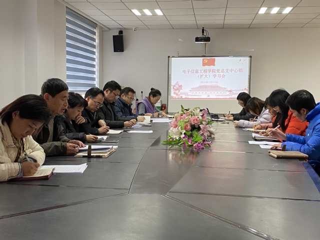 12月12日下午,电子信息工程学院党总支在宏博楼222会议室召开二级中心组(扩大)学习会。党总支理论中心组全体成员及部分内设机构负责人参加了学习研讨。学校巡学旁听督导检查工作组谢剑康副院长、组织部副部长朱芸、纪委冯银东老师一行列席了本次会议,开展巡学旁听工作。会议由党总支书记杨金刚主持。