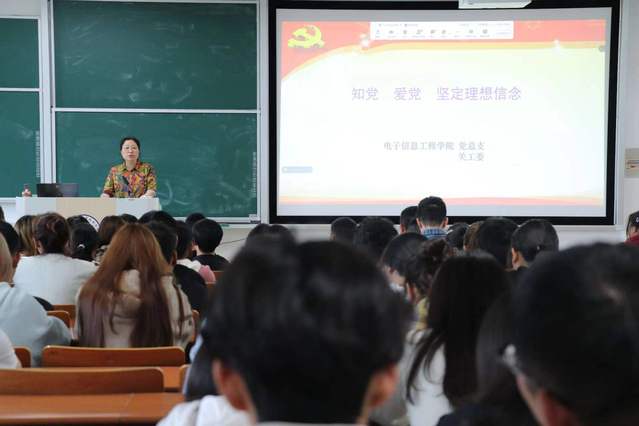 为加强我院2023级新生对中国共产党的认识,提高思想觉悟,端正入党动机,教育引导广大青年团员积极向党组织靠拢,10月11日下午,电子信息工程学院在明德楼302举行了一场以“知党、爱党、坚定理想信念”为主题的入党启蒙教育活动。讲座由电子信息工程学院关工委常务副主任赵家华老师主讲,学工办相关老师及2023级676名新生分线上线下参加了此次活动。