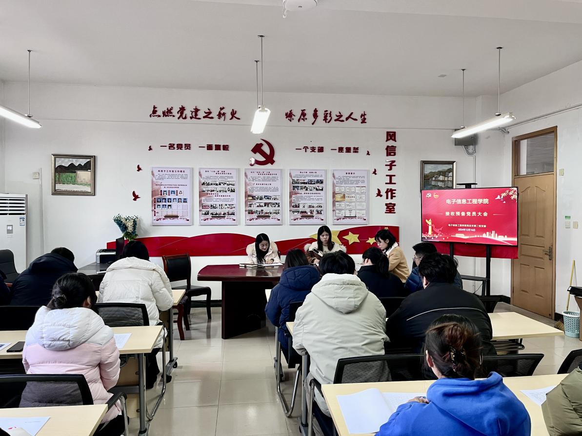 12月17日下午,电子信息工程学院党总支第二党支部在宏博楼320召开预备党员接收大会,第二党支部全体党员出席会议,大会由第二党支部书记吴颖老师主持。