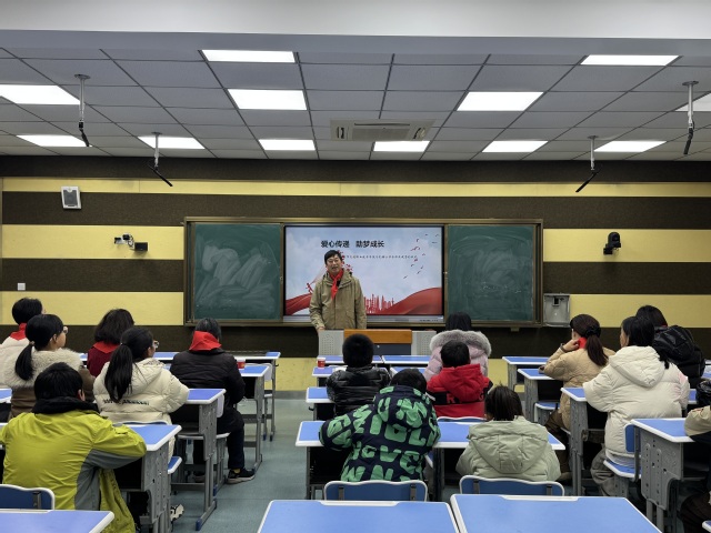 孔镇小学大队辅导员介绍了学校的历史、办学特色,并带领学生代表为我院教师佩戴红领巾。