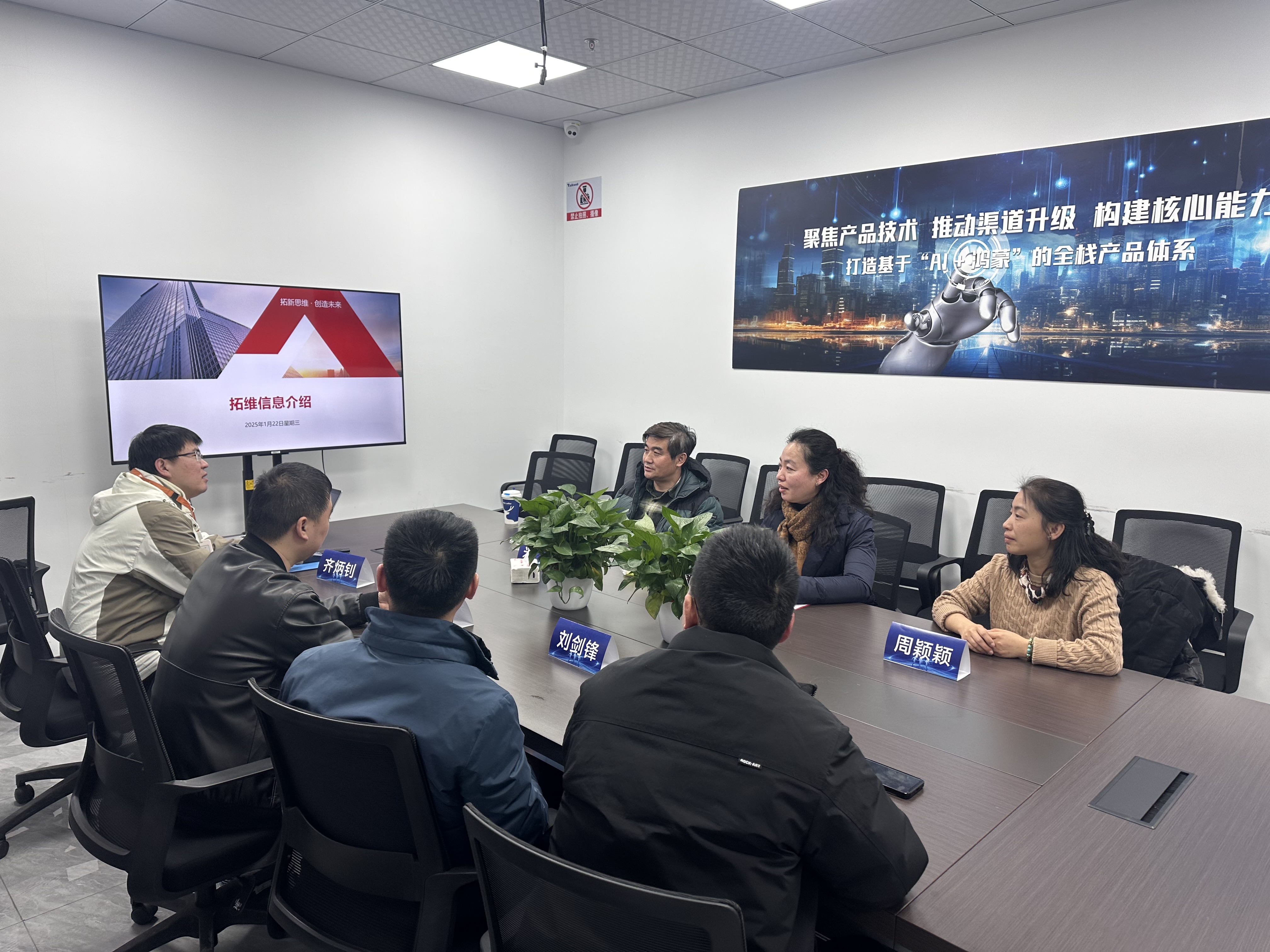 在拓维信息系统股份有限公司,企业高层领导热情接待了学院调研团队,并陪同参观了公司的研发中心。拓维信息作为行业领军企业,展示了其在智慧教育、智慧交通、智能制造等领域的卓越成就。从助力教育资源均衡化的智慧教育平台,到提升出行效率的智慧交通解决方案,再到广泛应用于智能制造领域的兆瀚系列智能计算产品,拓维信息的创新成果令人瞩目。高水娟院长在交流中详细介绍了学院的学科建设、专业设置及人才培养情况,强调学院始终致力于培养具有创新精神和实践能力的高素质人才。她表示,与拓维信息这样的行业翘楚合作,不仅能够提升学院的教学质量与科研水平,更能为学生搭建起更为广阔的职业发展平台。双方在人才培养模式、科研项目合作及学生实习就业等多个维度展开了深入探讨,并在共建高水平生产型实训基地、深化产教融合等关键领域达成了具体合作意向。