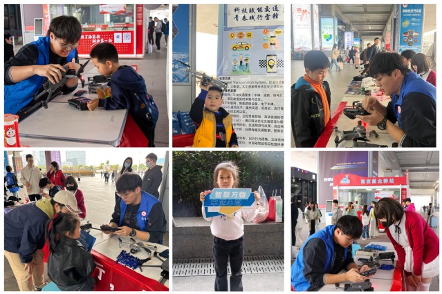 活动现场,志愿者们通过生动的宣传展板与耐心细致的讲解,向旅客普及了智慧交通技术在安全出行和便捷服务中的应用价值。在无人机展示区,志愿者通过现场实物展示与科普讲解,介绍了无人机的操控方法以及在交通巡检、应急救援中的具体应用,成为活动现场的亮点之一。