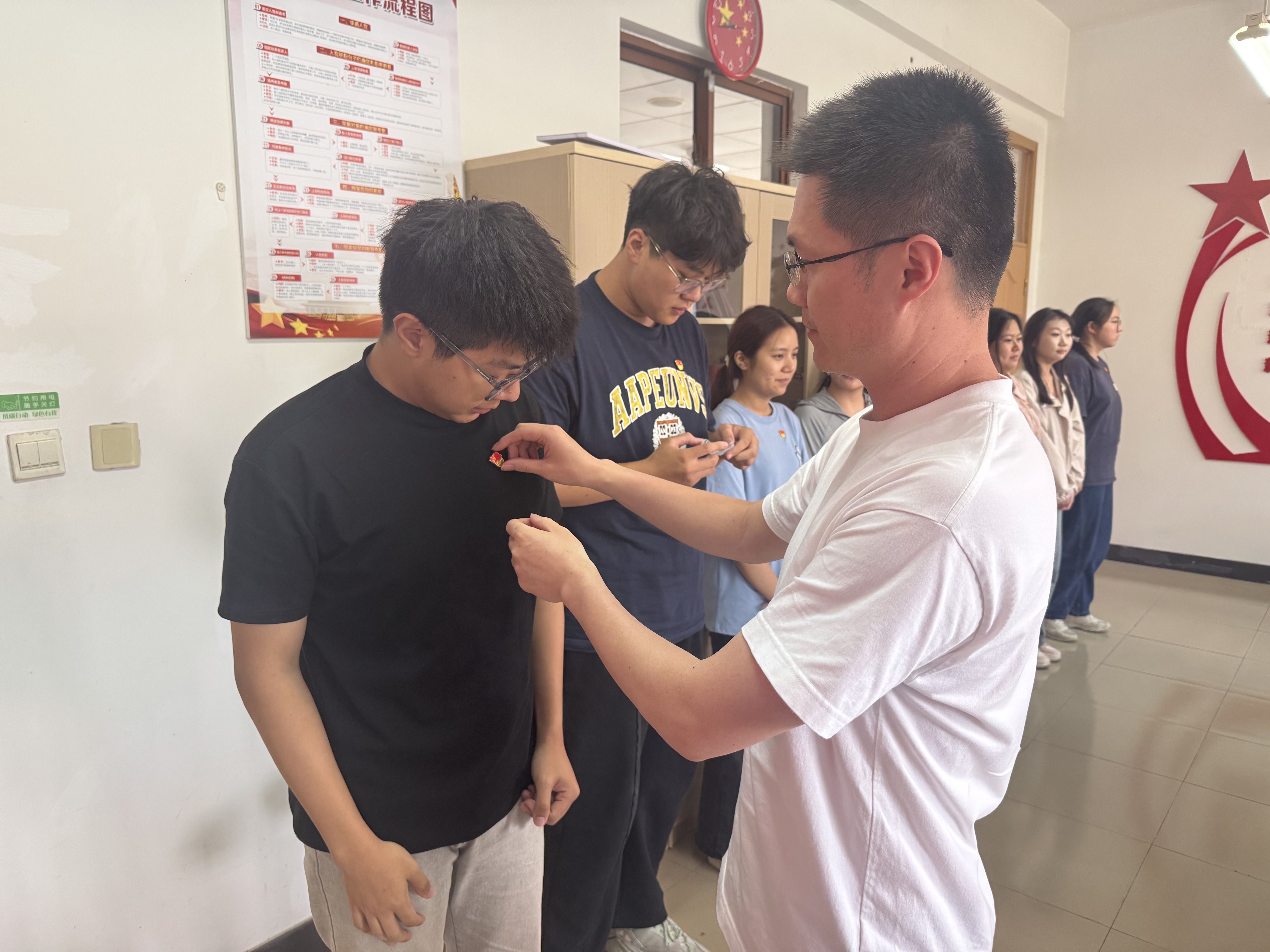 最后,党员老师为8名预备党员佩戴党员徽章。希望同学们在今后的学习和工作中牢记初心,并以一名党员的标准严格要求自己,为党的事业奋斗终身。