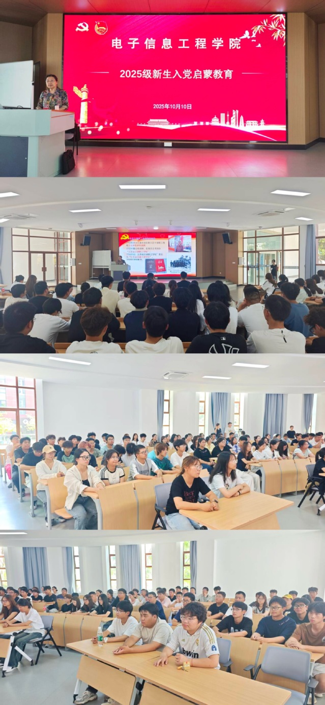 为加强我院2025级新生对中国共产党的认识,紧抓新生入学教育关键期,积极创新培养教育形式,引燃青年学子理想信念“火种”,深耕厚植爱党、爱国、爱社会主义情感,帮助青年学子知党、信党、入党,号召新生及时向党组织靠拢,进一步突出党建引领作用,近期,电子信息工程学院组织学生开展了2025级新生入党启蒙教育活动。