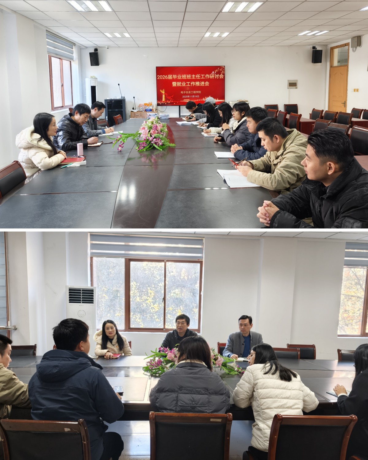 11月19日中午,电子信息工程学院在宏博楼222召开2026届毕业生就业工作推进会,学院党政领导、毕业班全体班主任参加会议,会议由党总支副书记吴蓉蓉主持。