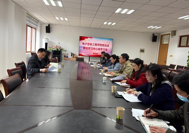 12月10日下午,电子信息工程学院党总支在宏博楼222会议室召开二级理论学习中心组学习会。校党委巡学旁听第四组组长、纪委书记张徐刚,工作组成员、党委组织部统战科科长周杨到会巡学旁听指导。党总支理论学习中心组全体成员参加了学习研讨。会议由党总支书记主持。